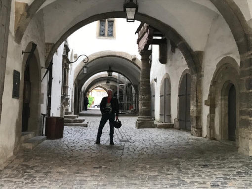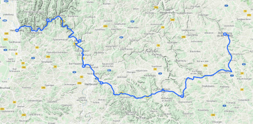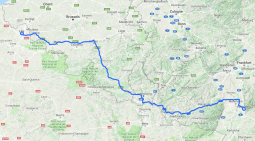 Under the Chunnel, down through Europe to Heidelburg. Then across to Rosenthal, before turning South to Fussen. Across the Alps to Verona and on to Florence. Then across the North Italy plain to Savona, back into mountains and through to the Vosges and up through France.