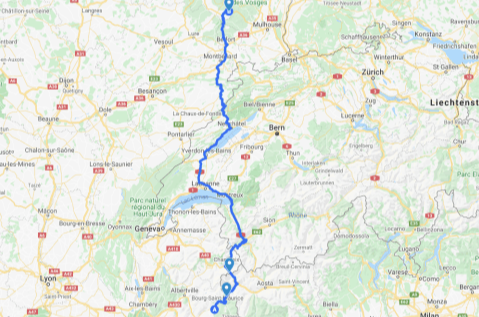 France, Luxembourg, Germany, Austria, Italy, France again, Italy again, Switzerland, France yet again and home.