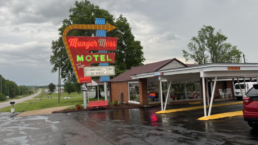 Zigzagging between old and older routings, through the Shed on a Bridge, along the Red Brick Road and on to the turkey tracks. Easy to miss. Eat at the Ariston Cafe, past Henry's Rabbit Ranch and the pink elephant onto the Chain of Rocks Bridge across the Mississippi. The Meramec caves "well, it's not Blue John Caverns", stonehenge replica at Rolla and the Devil's Elbow. Overnight in Lebanon at the Munger Moss Motel.