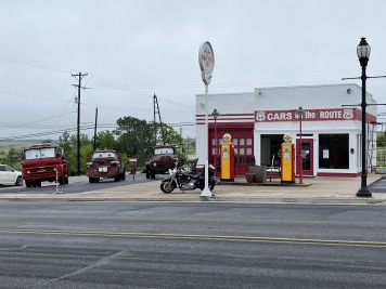The mosque and Red's Giant Hamburger in Springfield, Gay Parita gas station and Bonnie and Clyde's hideout in Joplin. At some point this afternoon, we're only 24 hours from Tulsa. Briefly into Kansas past the Cars inspiration in Galena and to Riverton Post Office B&B for the night.