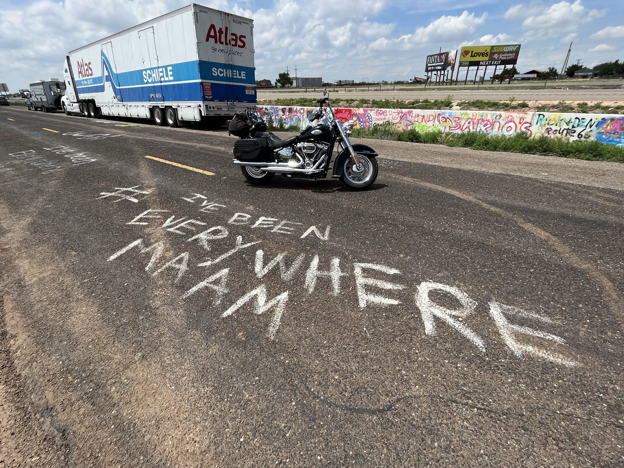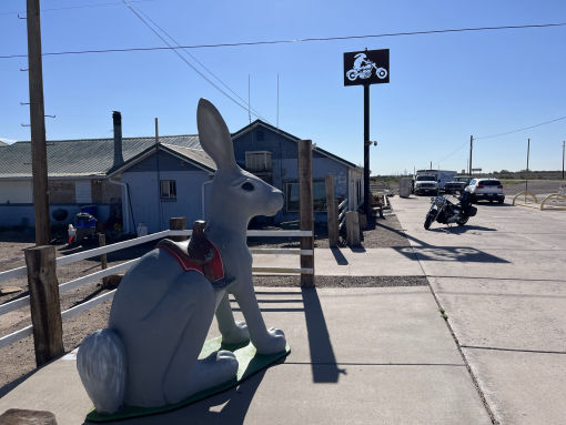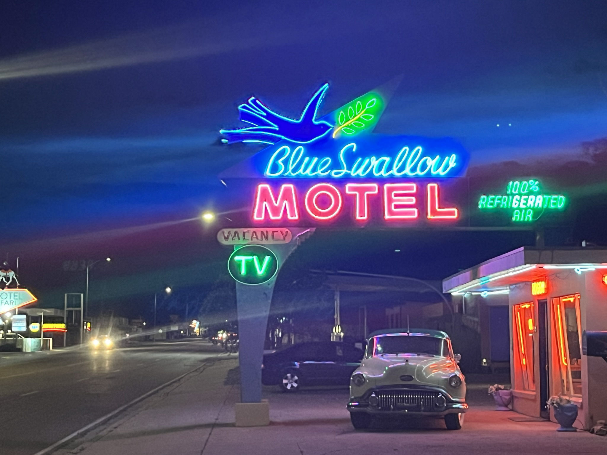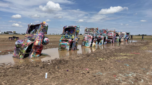 A day full of famous R66 moments across wide open prairie. The VW Bug Ranch and then the Cadillac version, armed with paint. Had to be done. Through Amarillo, nice man bought me lunch at the Golden Light Cafe, on to a rest stop at Adrian MidPoint Cafe, closed. The Glenrio ghost town is waking up as a drug sanctuary but it's The Blue Swallow Motel at Tucumcari tonight, total kitsch memorabilia..