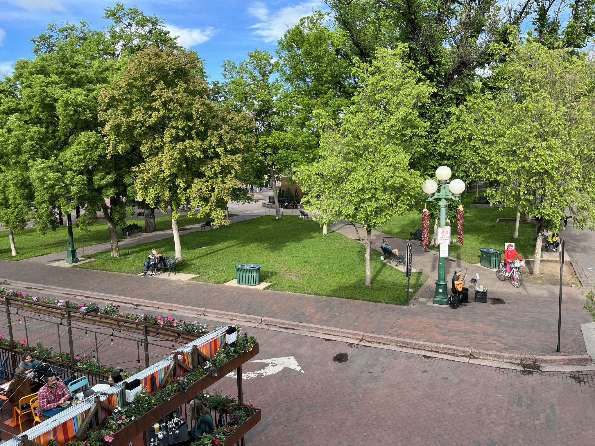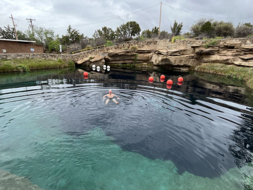 A bit of 1930s road today, taking the old routing up round Santa Fe and the other Las Vegas, where Jack and Captain America ended up in jail in Easy Rider. A swim in the Blue Hole at Santa Rosa, torrential rain and an hour under an bridge on the way. Flamenco cabaret and tapas, lots of art and tourist snares. Los Alamos (Who do you think you are Mr Feynman ?) is close but not close enough.