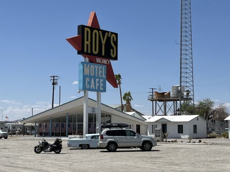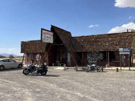 The famous bit of the old Route, over Sitgreaves Pass and through Oatman, down to the Colorado River and quick side trip to see London Bridge at Lake Havasu. Then the petroglyphs at Needles before endless really hot desert, sandstorms and Roys Cafe by the Amboy lions. The Amboy crater is 'not recommended on foot between April and October. Good advice, it's pushing 40 here. then Bagdad complete with tree, the cafe is Newberry Springs but not desolate enough for the movie. Atomic memorial at Ludlow and beer, medals, shower and bed at Barstow.
