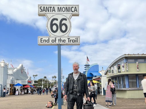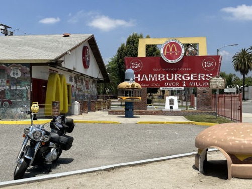 A gentle end, past the bottle ranch and Iron Hog Bar, over Cajun Summit and a drop in at the first McDonalds in the world. Now privately owned and they're not fans of the chain ethos. Then it's into LA sprawl and increasing traffic, little left of the old waypoints in the urge to redevelop. Past the Madonna of the Trails and down to Santa Monica for selfies. Simples